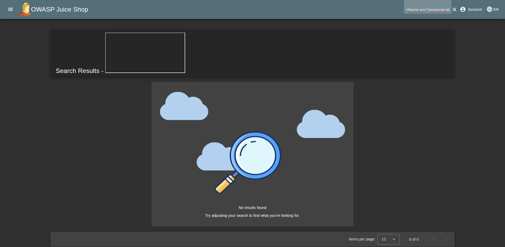 When she searches for "<iframe src=\"javascript:alert(`xss`)\">"